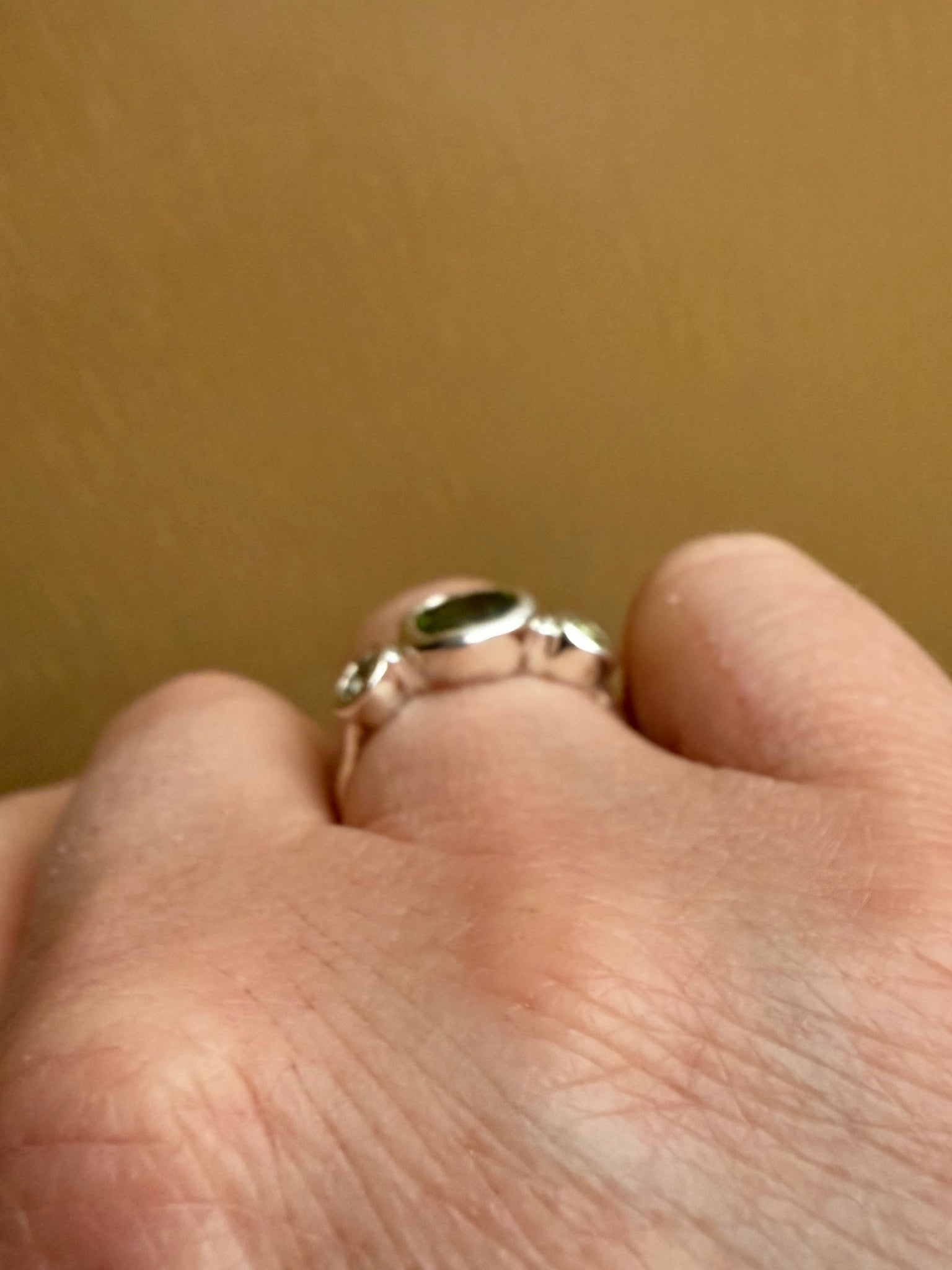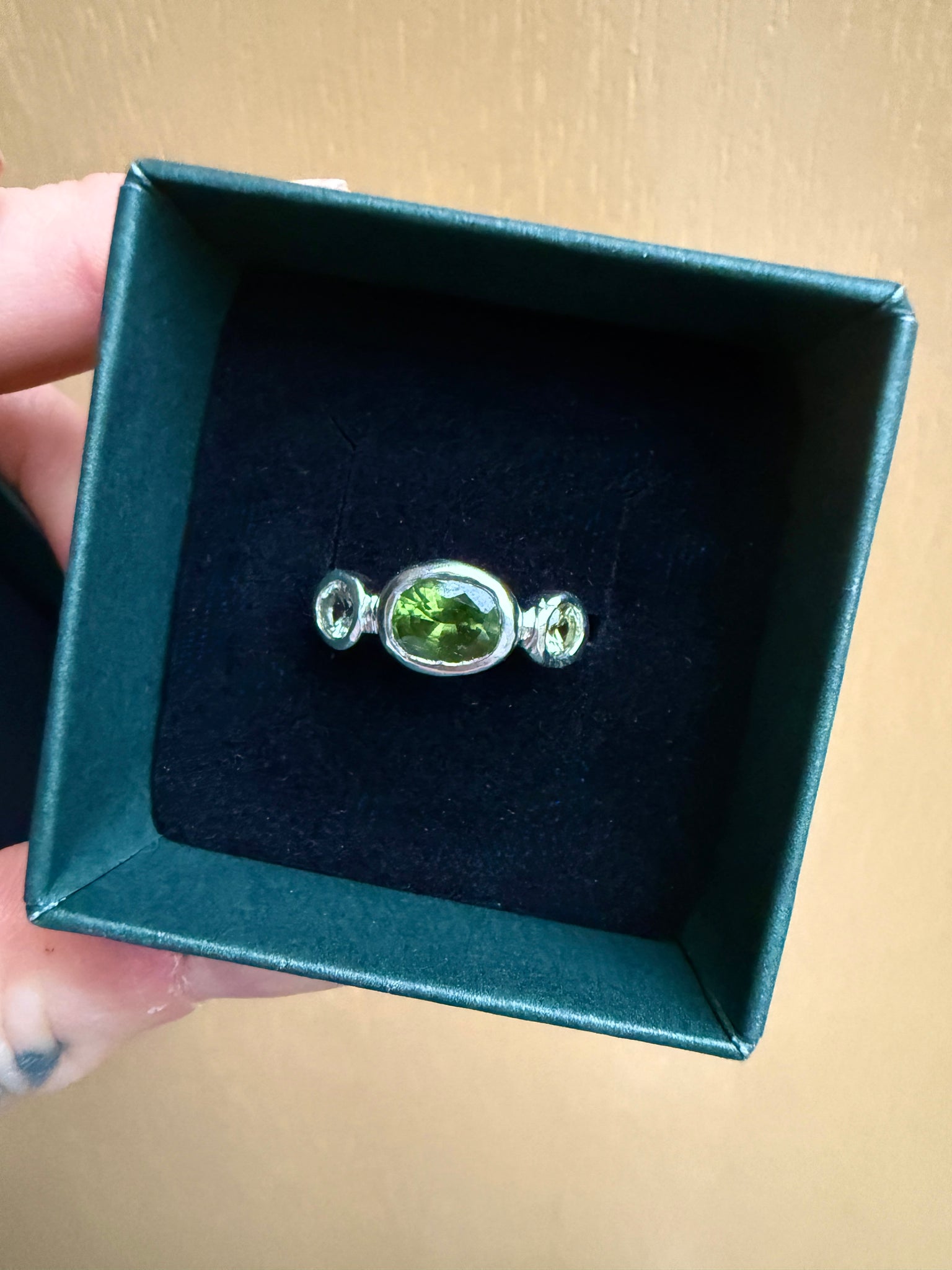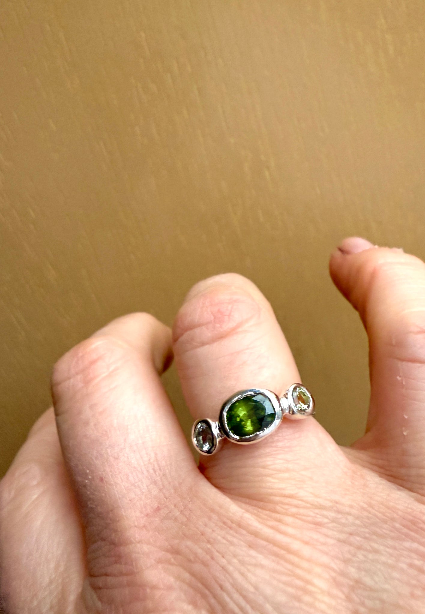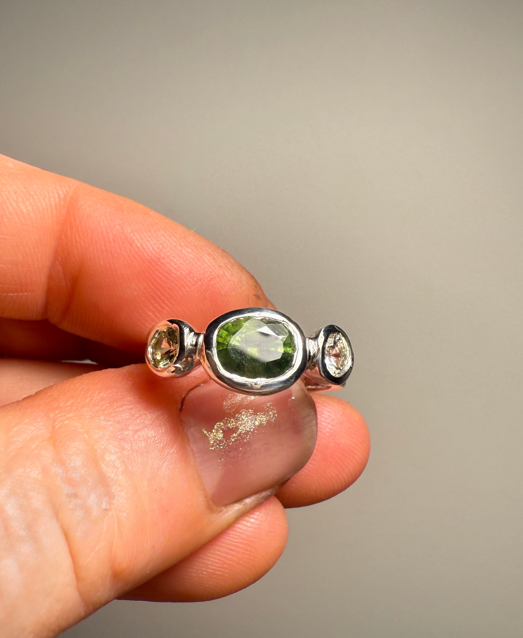 This harmonious but truly show stopping selection of two smaller tourmalines (in zesty lemon and silvery grey) and a big juicy green sapphire, are what dreams are made of.
