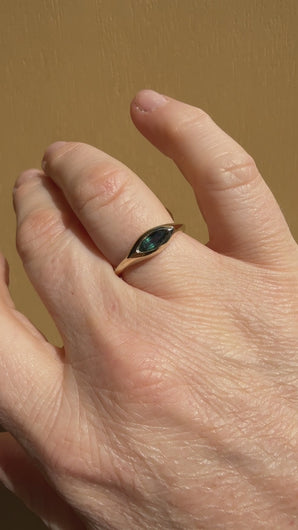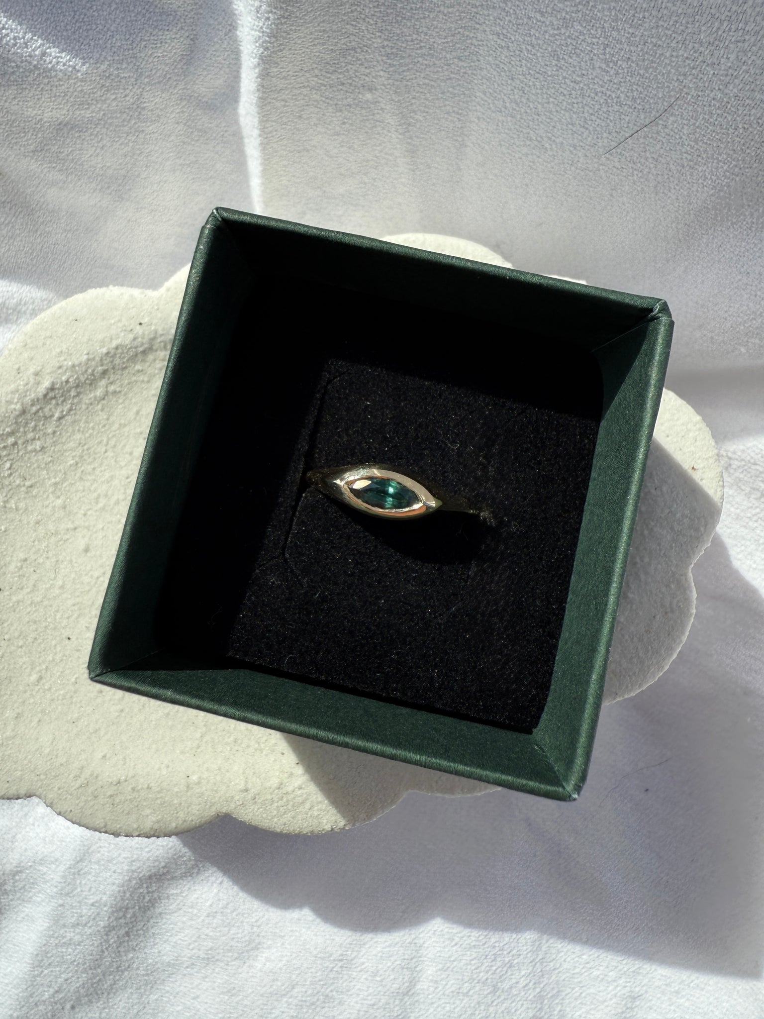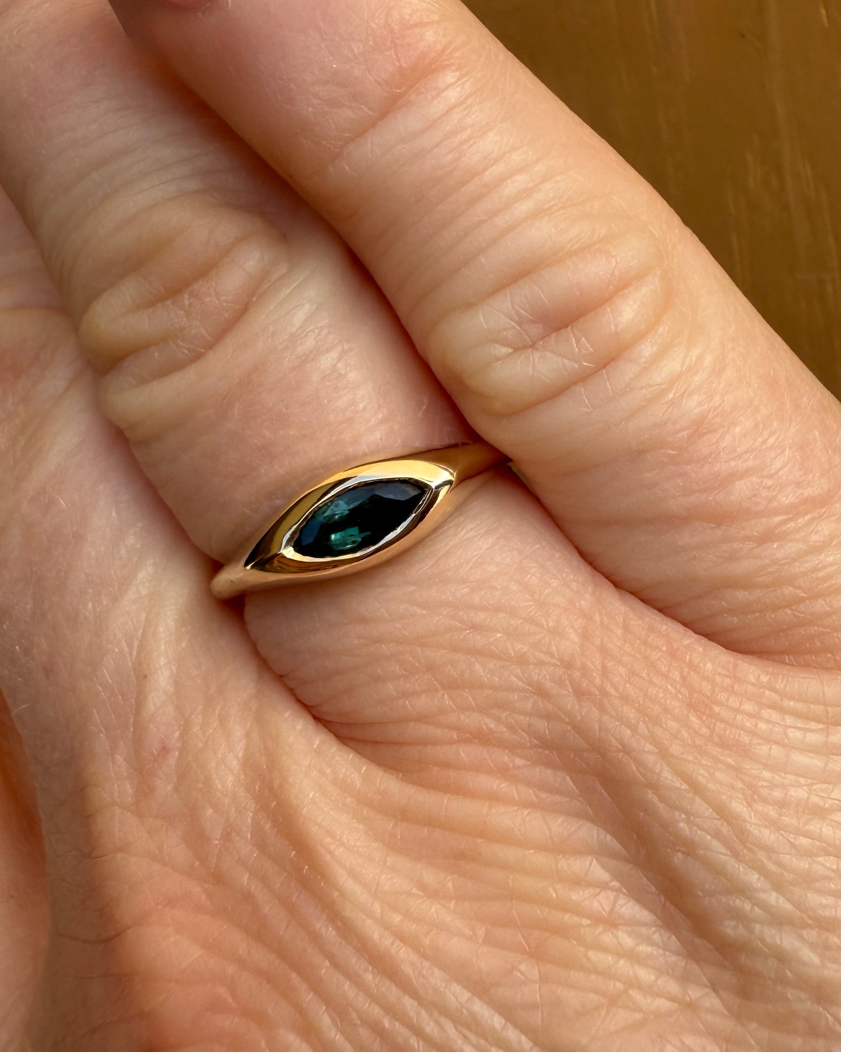 Classic, yet beautifully unique with its marquise shaped Madagascan Sapphire in a deep saturated Teal green.